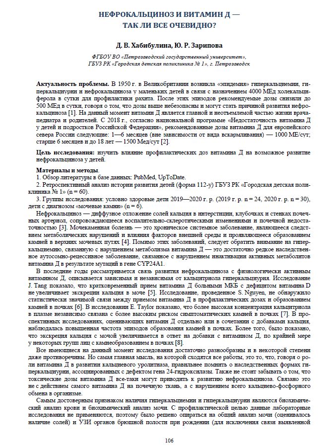 Нефрокальциноз и витамин Д – так ли все очевидно?Тюкачева Валентина Юрьевна, Зарипова Юлия Рафаэльевна, Соколов Александр Леонидович, Шляхтенкова Анна Леонидовна