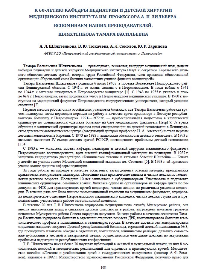Статья посвящена Тамаре Васильевне Шляхтенковой – врачу-педиатру, гематологу, кандидату медицинский наук, доценту кафедры педиатрии и детской хирургии Медицинского института ПетрГУ, секретарю Карельского научного общества детских врачей, ветерану труда Российской Федерации, члену правления общественной организации «Карельский союз бывших малолетних узников финских концлагерей».