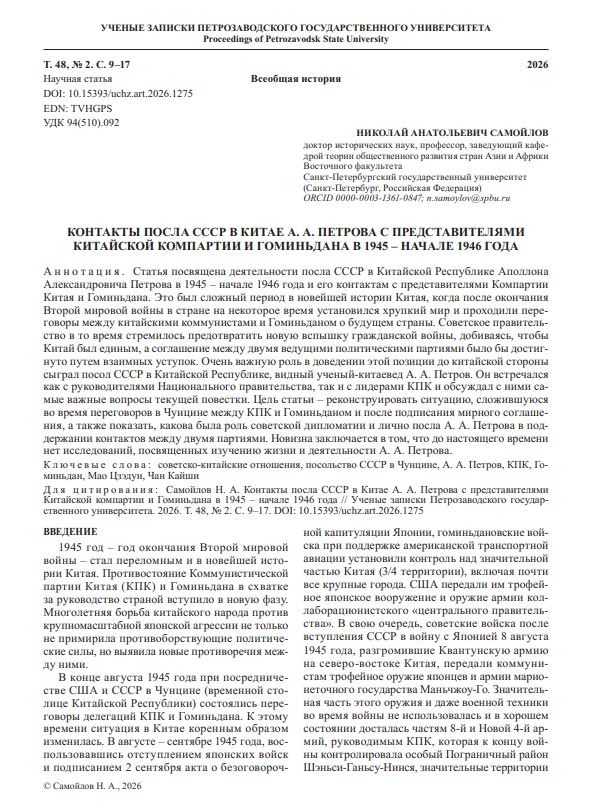 Контакты посла СССР в Китае А. А. Петрова с представителями Китайской компартии и Гоминьдана в 1945 – начале 1946 года