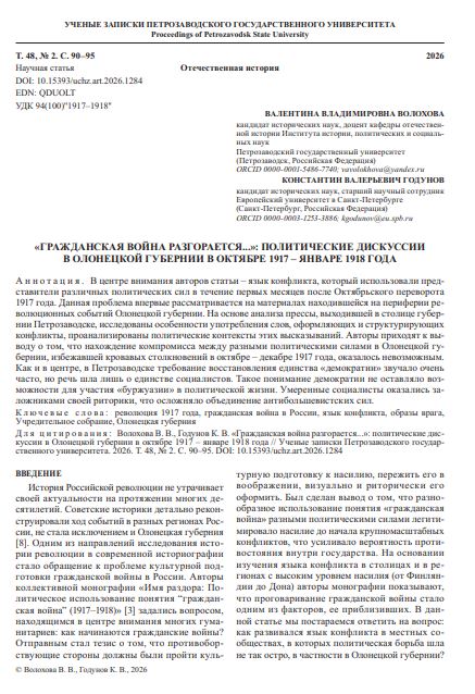 «Гражданская война разгорается...»: политические дискуссии в Олонецкой губернии в октябре 1917 – январе 1918 годаДубровская Елена Юрьевна