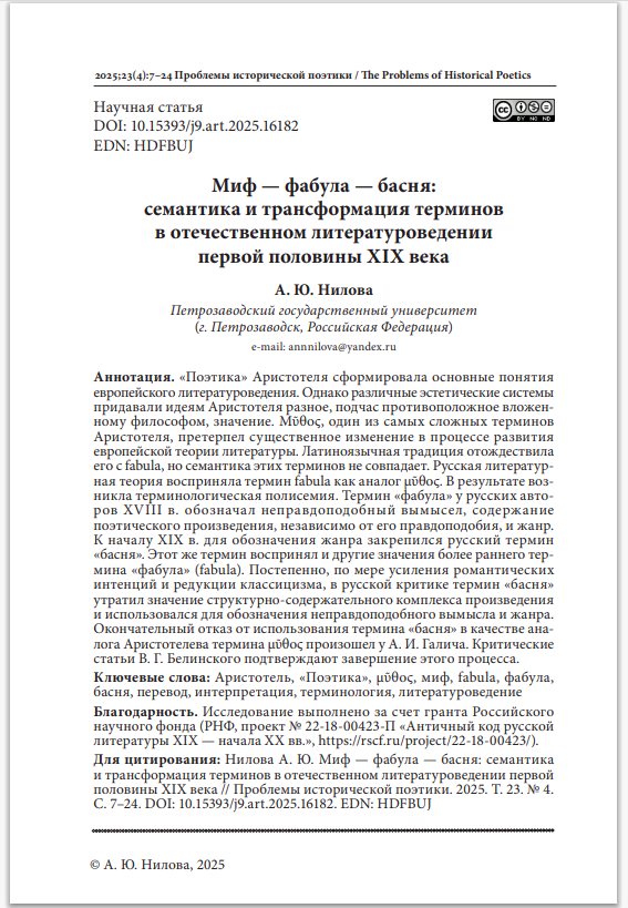 Миф – фабула – басня: семантика и трансформация терминов в отечественном литературоведении первой половины XIX векаСмирнова Екатерина Леонидовна, Литинская Евгения Петровна