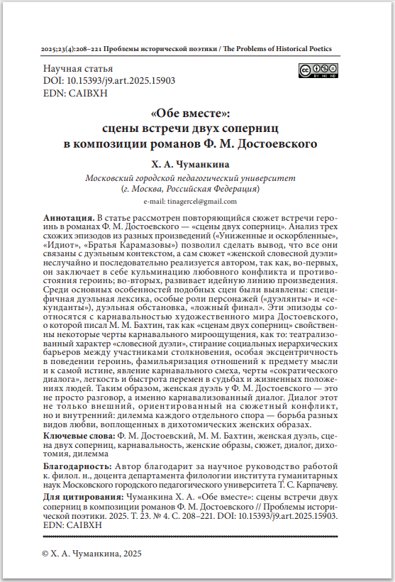 В статье рассмотрен повторяющийся сюжет встречи героинь в романах Ф. М. Достоевского – «сцены двух соперниц». Анализ трех схожих эпизодов из разных произведений («Униженные и оскорбленные», «Идиот», «Братья Карамазовы») позволил сделать вывод, что все они связаны с дуэльным контекстом, а сам сюжет «женской словесной дуэли» неслучайно и последовательно реализуется автором, так как, во-первых, он заключает в себе кульминацию любовного конфликта и противостояния героинь; во-вторых, развивает идейную линию произведения.