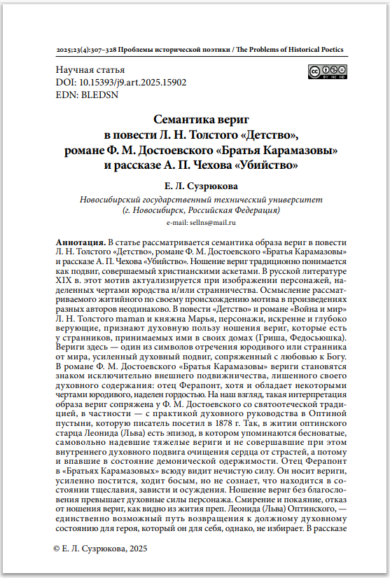 Семантика вериг в повести Л. Н. Толстого «Детство», романе Ф. М. Достоевского «Братья Карамазовы» и рассказе А. П. Чехова «Убийство»Кибальник Сергей Акимович