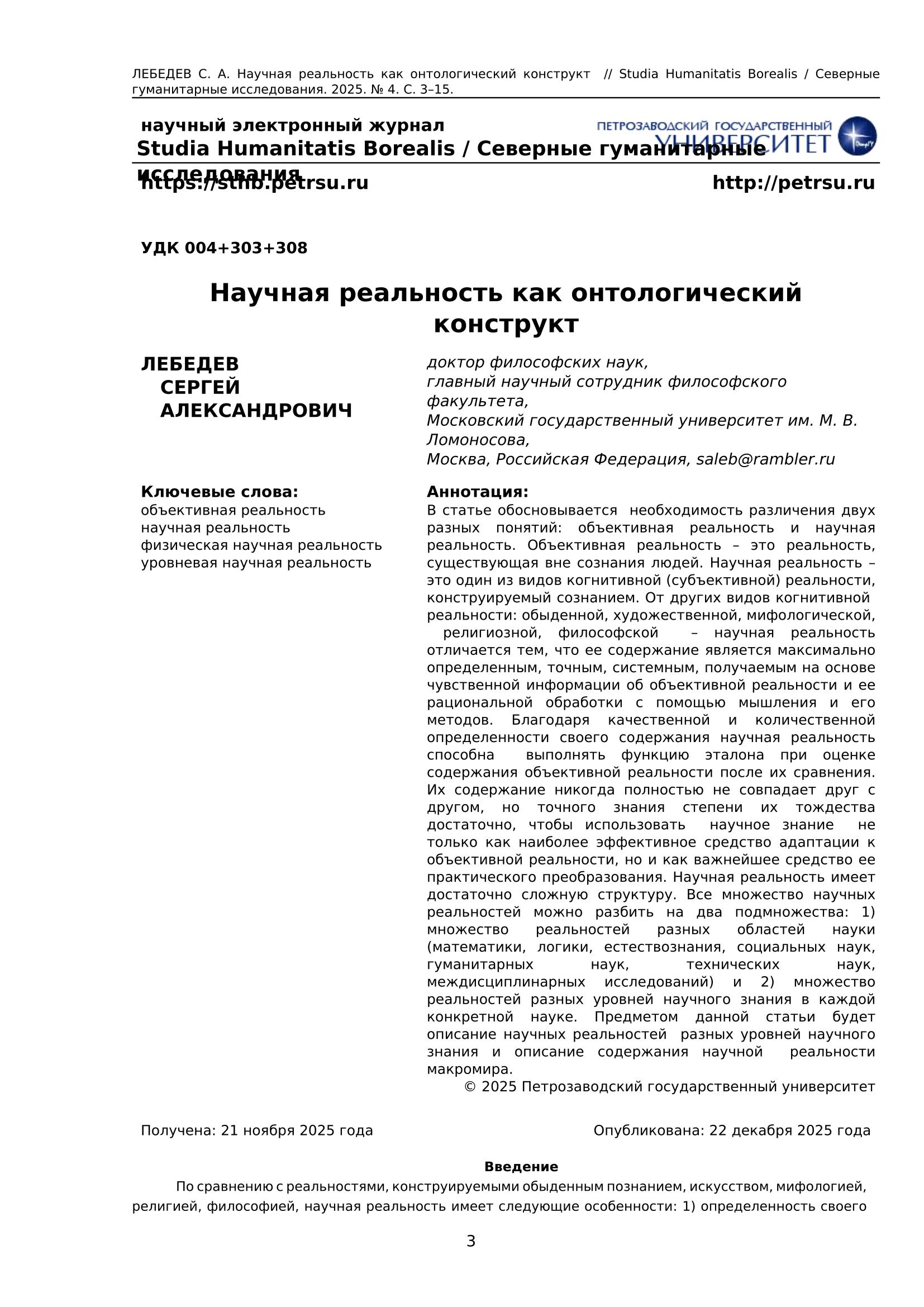 В статье обосновывается необходимость различения двух разных понятий: объективная реальность и научная реальность. Объективная реальность – это реальность, существующая вне сознания людей. Научная реальность – это один из видов когнитивной (субъективной) реальности, конструируемый сознанием. От других видов когнитивной реальности: обыденной, художественной, мифологической, религиозной, философской – научная реальность отличается тем, что ее содержание является максимально определенным, точным, системным, получаемым на основе чувственной информации об объективной реальности и ее рациональной обработки с помощью мышления и его методов. Благодаря качественной и количественной определенности своего содержания научная реальность способна выполнять функцию эталона при оценке содержания объективной реальности после их сравнения. Их содержание никогда полностью не совпадает друг с другом, но точного знания степени их тождества достаточно, чтобы использовать научное знание не только как наиболее эффективное средство адаптации к объективной реальности, но и как важнейшее средство ее практического преобразования. Научная реальность имеет достаточно сложную структуру. Все множество научных реальностей можно разбить на два подмножества: 1) множество реальностей разных областей науки (математики, логики, естествознания, социальных наук, гуманитарных наук, технических наук, междисциплинарных исследований) и 2) множество реальностей разных уровней научного знания в каждой конкретной науке. Предметом данной статьи будет описание научных реальностей разных уровней научного знания и описание содержания научной реальности макромира.