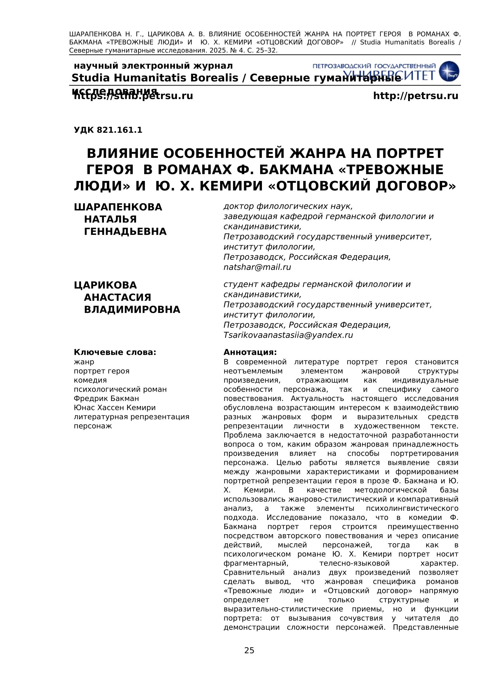 Влияние особенностей жанра на портрет героя в романах Ф. Бакмана «Тревожные люди» и Ю. Х. Кемири «Отцовский договор»Васильева Светлана Владимировна, Ардышев Илья Алексеевич