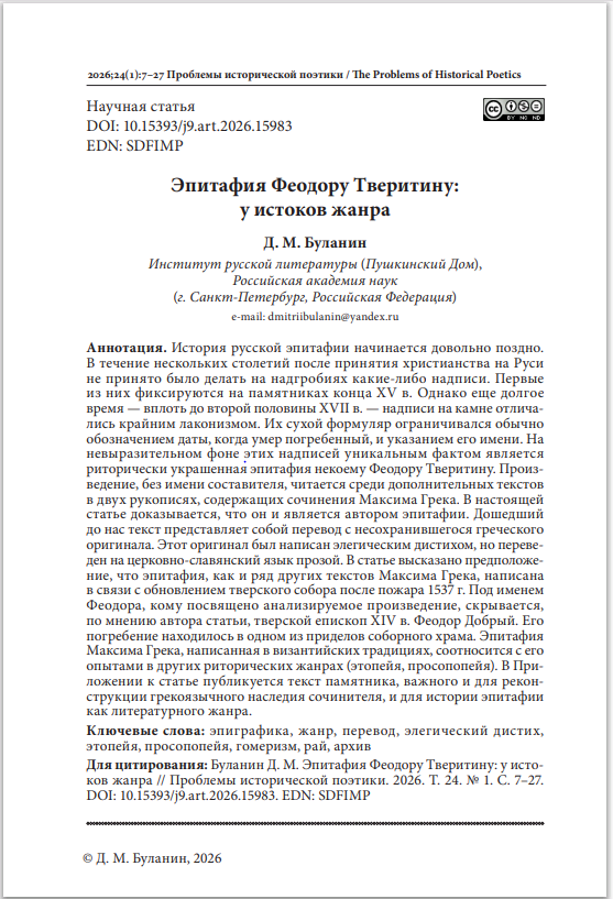 История русской эпитафии начинается довольно поздно. В течение нескольких столетий после принятия христианства на Руси не принято было делать на надгробиях какие-либо надписи. Первые из них фиксируются на памятниках конца XV в. Однако еще долгое время – вплоть до второй половины XVII в. – надписи на камне отличались крайним лаконизмом. Их сухой формуляр ограничивался обычно обозначением даты, когда умер погребенный, и указанием его имени. На невыразительном фоне этих надписей уникальным фактом является риторически украшенная эпитафия некоему Феодору Тверитину. Произведение, без имени составителя, читается среди дополнительных текстов в двух рукописях, содержащих сочинения Максима Грека. В настоящей статье доказывается, что он и является автором эпитафии.