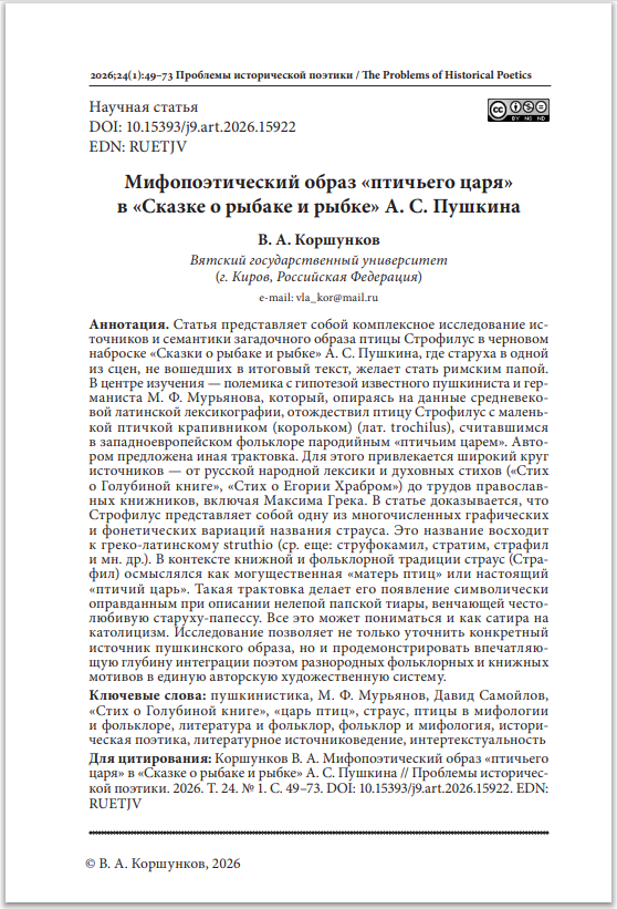 Статья представляет собой комплексное исследование источников и семантики загадочного образа птицы Строфилус в черновом наброске «Сказки о рыбаке и рыбке» А. С. Пушкина, где старуха в одной из сцен, не вошедших в итоговый текст, желает стать римским папой.