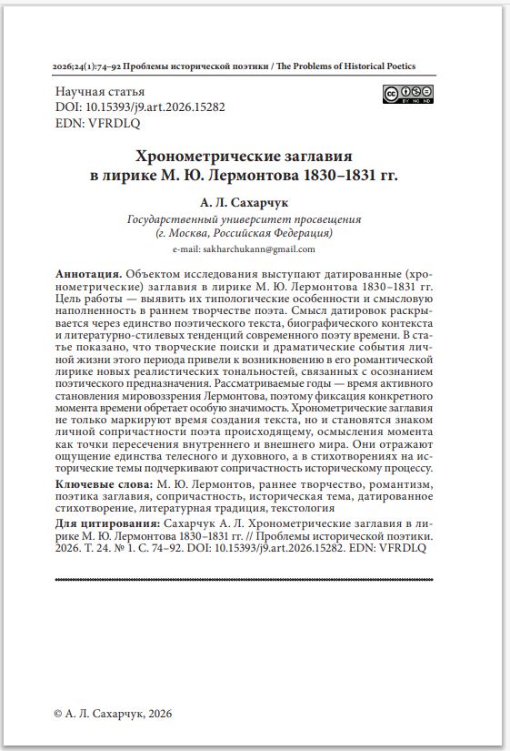 Объектом исследования выступают датированные (хронометрические) заглавия в лирике М. Ю. Лермонтова 1830–1831 гг. Цель работы – выявить их типологические особенности и смысловую наполненность в раннем творчестве поэта. Смысл датировок раскрывается через единство поэтического текста, биографического контекста и литературно-стилевых тенденций современного поэту времени. В статье показано, что творческие поиски и драматические события личной жизни этого периода привели к возникновению в его романтической лирике новых реалистических тональностей, связанных с осознанием поэтического предназначения.