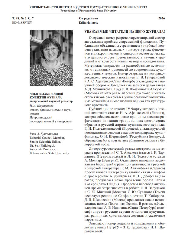 Очередной номер репрезентирует широкий спектр актуальных проблем современной филологии. Публикации объединены стремлением к глубокой концептуализации языковых и литературных феноменов в диахроническом и синхроническом аспектах, что демонстрирует преемственность научных традиций и открытость новым методам исследования.