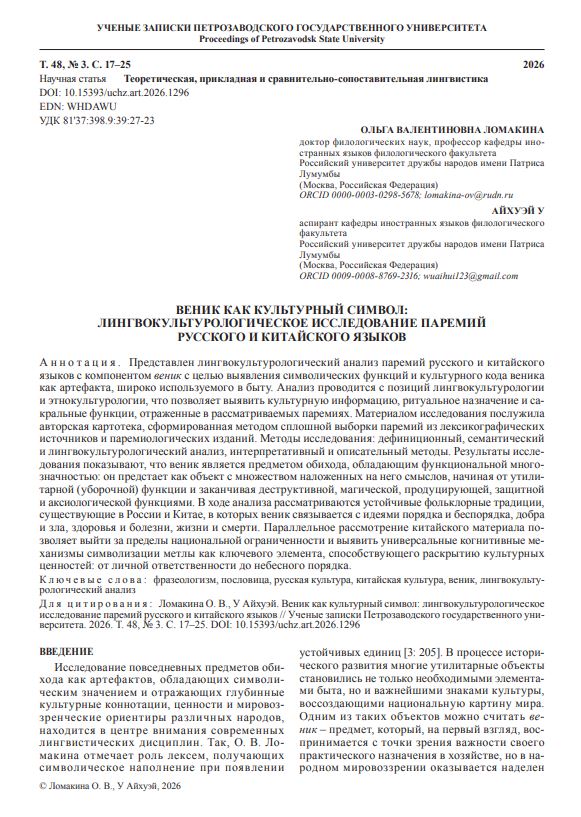Представлен лингвокультурологический анализ паремий русского и китайского языков с компонентом веник с целью выявления символических функций и культурного кода веника как артефакта, широко используемого в быту. Анализ проводится с позиций лингвокультурологии и этнокультурологии, что позволяет выявить культурную информацию, ритуальное назначение и сакральные функции, отраженные в рассматриваемых паремиях.