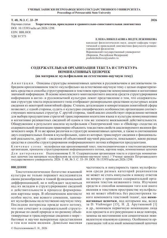 Содержательная организация текста и структура номинативных цепочек (на материале мультфильмов на естественно-научную тему)Шершнёва Ольга Николаевна