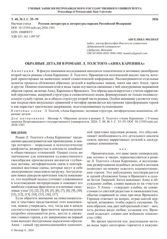 В фокусе внимания исследования находятся тематическое и мотивное своеобразие второй части романа «Анна Каренина» Л. Толстого. Применяется поэтический анализ текста, который ориентирован на выявление новой семантической информации. Рассматриваются отдельные аспекты процесса сближения образных деталей и вербальных знаков, таких как свет, блеск, треск и другие.