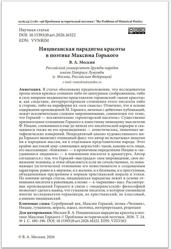 В статье обосновано предположение, что исследователи прозы эпохи кризиса сознания либо по цензурным соображениям, либо в силу инерции неадекватно представляли горьковский «закон красоты» и, как следствие, интерпретировали сочинения этого писателя либо в стороне, либо на периферии их «оси смысла». Отмечено, что в основе содержания произведений М. Горького, начиная с дебютных публикаций, лежит исключительно сложное миропонимание, сомнителен тот тезис, что Горький – исключительно «пролетарский писатель». Существенно признательное отношение Горького к известному немецкому мыслителю Ф. Ницше, сложившееся еще до начала его писательской карьеры и сказавшееся также на его произведениях – атеистических, лишенных метафизических измерений. Непредвзятый анализ художественного мира Горького выявляет очевидный факт, что автор не испытывал эмпатии ни к народным массам, ни к отдельным представителям народа.