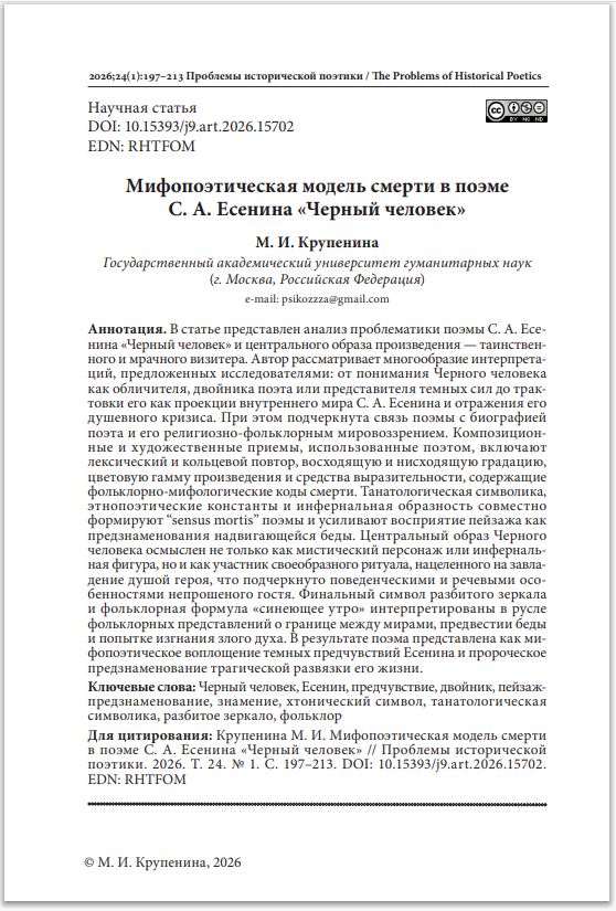 Мифопоэтическая модель смерти в поэме С. А. Есенина «Черный человек»Леонов Иван Сергеевич, Цинтула Игорь