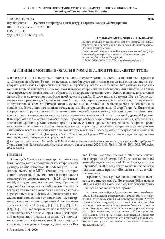 Цель статьи – показать, как интертекстуальные связи с античностью в романе А. Дмитриева «Ветер Трои», во-первых, способствуют пониманию героя как символа эпохи, вовторых, усиливают современный взгляд на проблему человека и судьбы. Актуальность предложенной темы заключается в постоянном интересе современных писателей к античности не только через преемственность сюжетов и образов, но и на уровне эстетики героического и эпического, а также философии и художественных форм изображения судьбы.