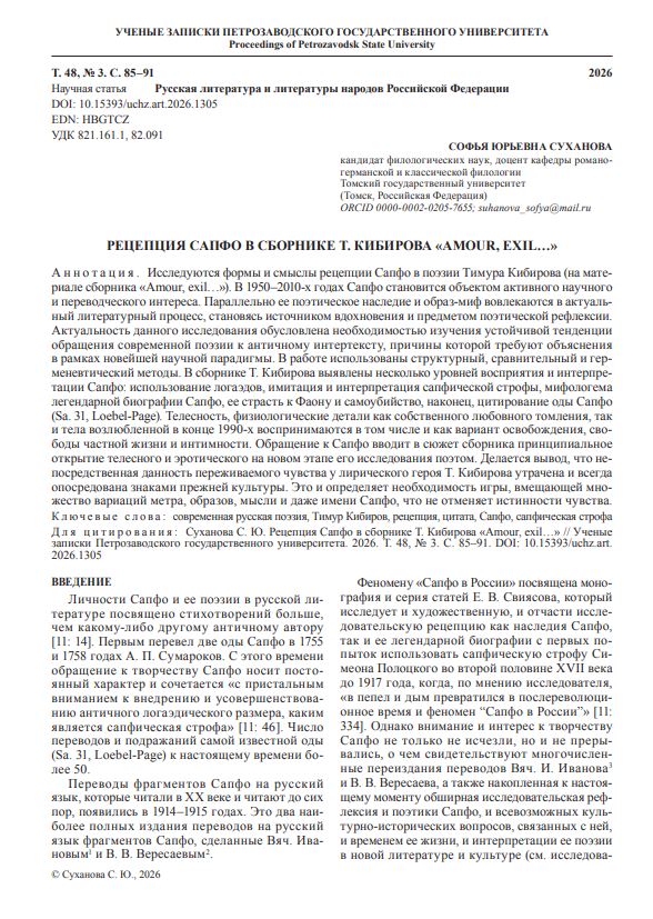 Исследуются формы и смыслы рецепции Сапфо в поэзии Тимура Кибирова (на материале сборника «Amour, exil…»). В 1950–2010-х годах Сапфо становится объектом активного научного и переводческого интереса. Параллельно ее поэтическое наследие и образ-миф вовлекаются в актуальный литературный процесс, становясь источником вдохновения и предметом поэтической рефлексии.