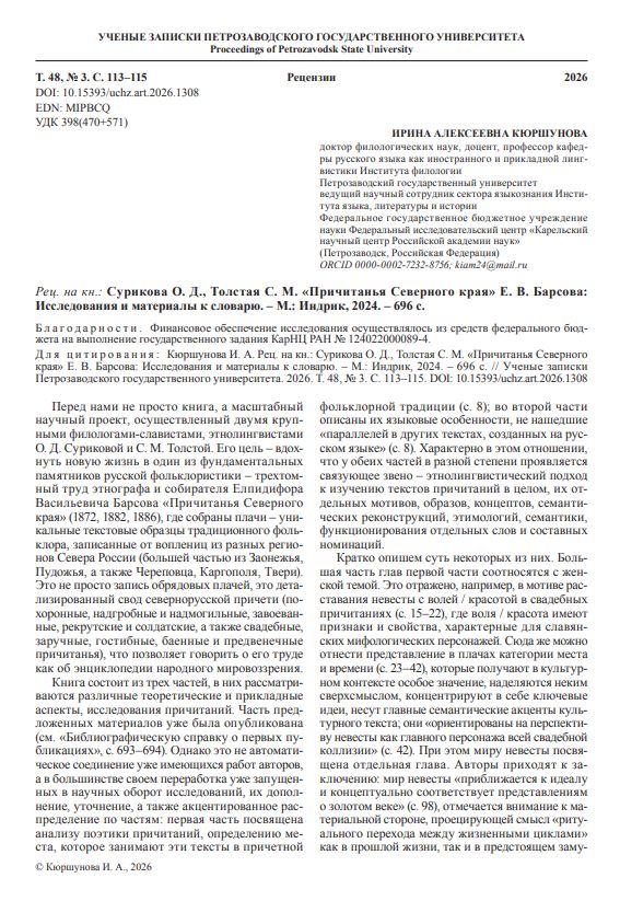 Рец. на кн.: Сурикова О. Д., Толстая С. М. «Причитанья Северного края» Е. В. Барсова: Исследования и материалы к словарю. – М.: Индрик, 2024.