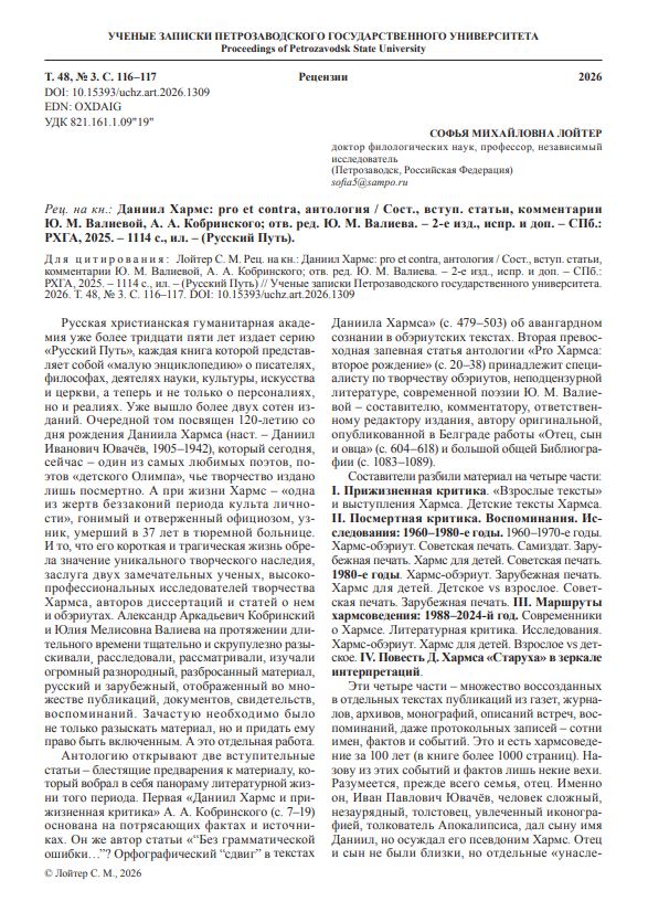 Рец. на кн.: Даниил Хармс: pro et contra, антология / Сост., вступ. статьи, комментарии Ю. М. Валиевой, А. А. Кобринского; отв. ред. Ю. М. Валиева. – 2-е изд., испр. и доп. – СПб.: РХГА, 2025.