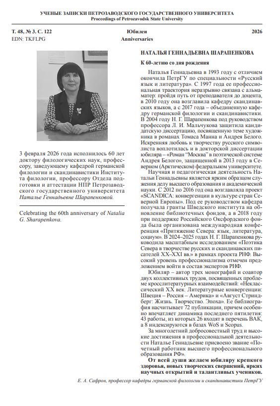 3 февраля 2026 года исполнилось 60 лет доктору филологических наук, профессору, заведующему кафедрой германской филологии и скандинавистики Института филологии, профессору Отдела подготовки и аттестации НПР Петрозаводского государственного университета Наталье Геннадьевне Шарапенковой.