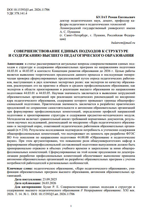 В статье рассматриваются актуальные вопросы совершенствования единых подходов к структуре и содержанию образовательных программ по направлениям подготовки 44.03.01 и 44.03.05 в контексте Концепции развития образования до 2036 г.