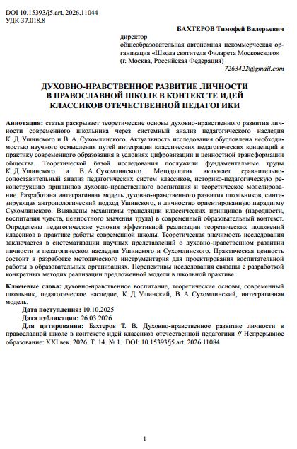 Духовно-нравственное развитие личности в православной школе в контексте идей классиков отечественной педагогики