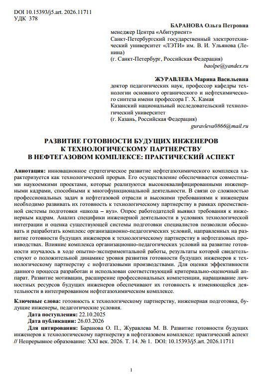 Инновационное стратегическое развитие нефтегазохимического комплекса характеризуется как технологический прорыв. Его осуществление обеспечивается совместными наукоемкими проектами, которые реализуются высококвалифицированными инженерными кадрами, способными к многофункциональной деятельности. В связи со сложностью профессиональных задач в нефтегазовой отрасли и высокими требованиями к инженерам необходимо развивать их готовность к технологическому партнерству в рамках преемственной системы подготовки «школа ‒ вуз».