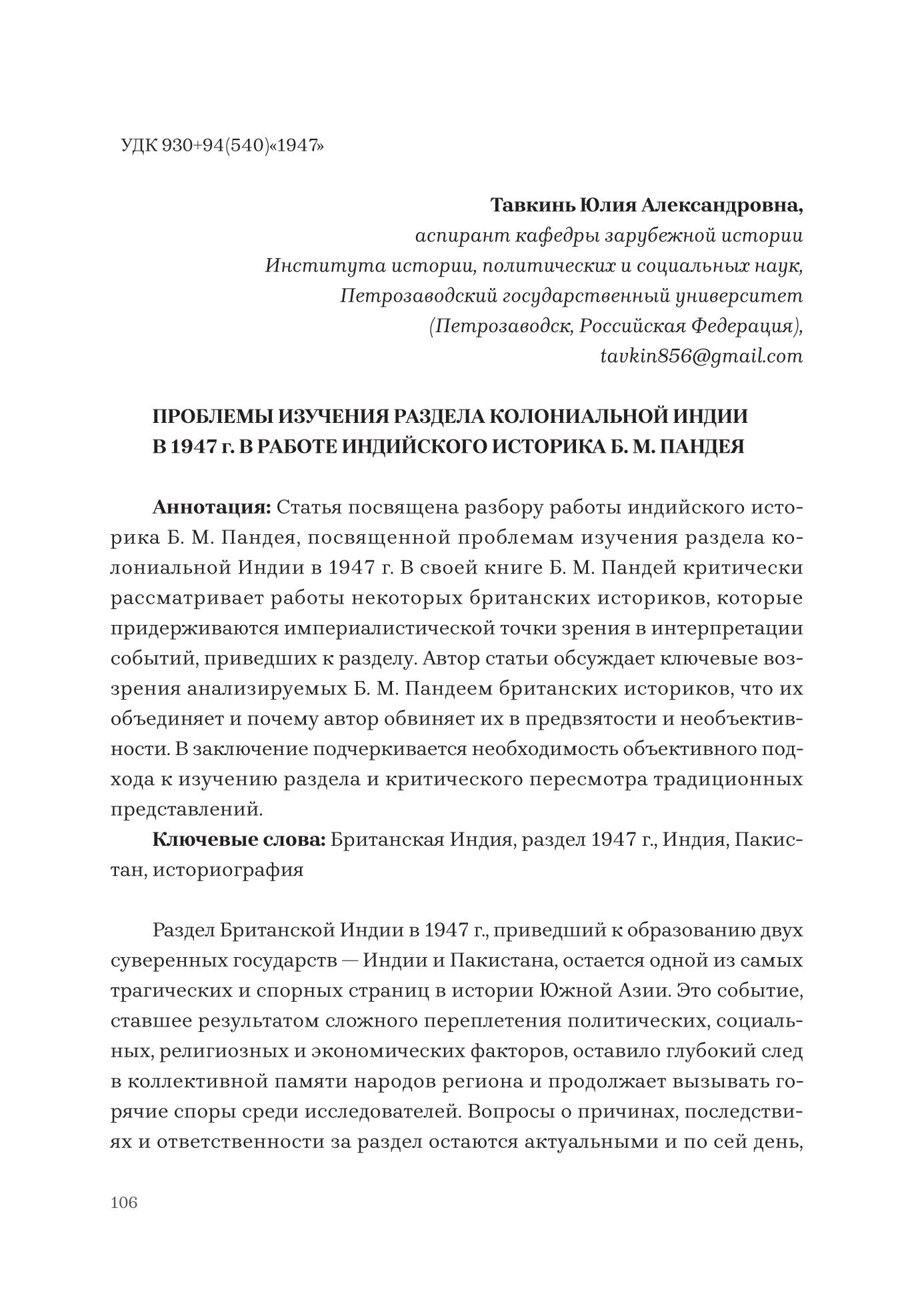 Статья посвящена разбору работы индийского историка Б. М. Пандея, посвященной проблемам изучения раздела колониальной Индии в 1947 г. В своей книге Б. М. Пандей критически рассматривает работы некоторых британских историков, которые придерживаются империалистической точки зрения в интерпретации событий, приведших к разделу. Автор статьи обсуждает ключевые воззрения анализируемых Б. М. Пандемем британских историков, что их объединяет и почему автор обвиняет их в предвзятости и необъективности. В заключение подчеркивается необходимость объективного подхода к изучению раздела и критического пересмотра традиционных представлений.