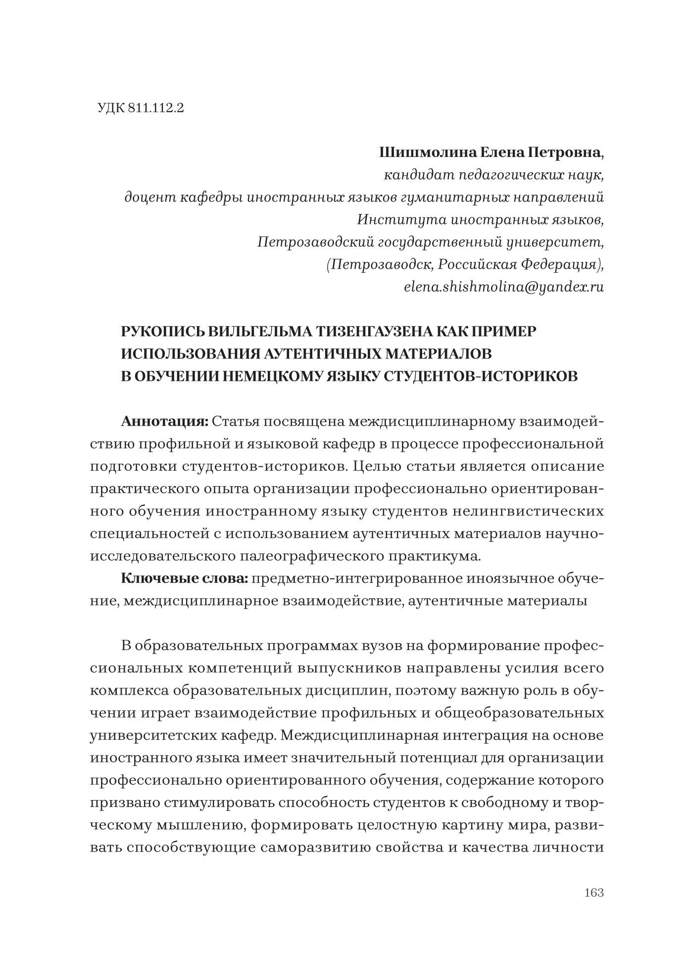 Рукопись Вильгельма Тизенгаузена как пример использования аутентичных материалов в обучении немецкому языку студентов-историков
