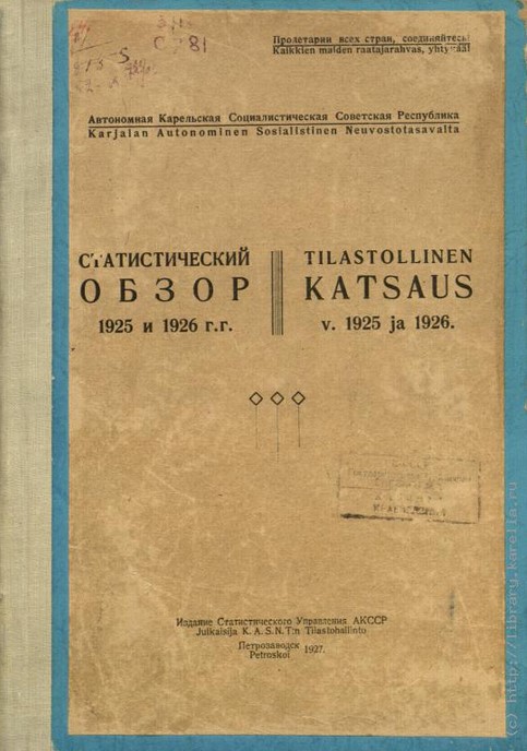 Статистический обзор, 1925 и 1926 г.г. = Tilastollinen katsaus v. 1925 ja 1926 / Автономная Карельская Социалистическая Советская Республика. Петрозаводск : Издание Статистического Управления АКССР, 1927. 256 с. Ч. VI изд. отдельной брошюрой. Текст на рус., фин. яз.