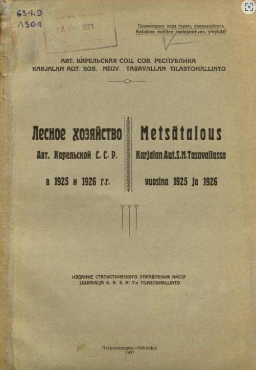Лесное хозяйство Авт. Карельской ССР в 1925 и 1926 г.г. = Metsätalous Karjalan Aut. S. N. Tasavallassa vuosima 1925 ja 1926 / Авт. Карельская Соц. Сов. Республика ; сост. И. А. Кищенко. — Петрозаводск : Издание статистического управления АКССР, 1927. — [50] с. — Текст парал. на рус. и фин. яз. — Копии страниц книги в формате jpg. — URL: http://elibrary.petrsu.ru/books/9231 (дата обращения: 05.12.2025)