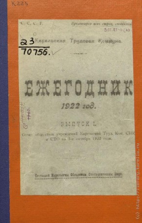 Карельская Трудовая Коммуна. Ежегодник. 1922. Вып. 1 / Сост. Карел. обл. стат. бюро. — Петрозаводск : Б. и., 1923. — [159] с. — Копии страниц книги в формате jpg. — URL: http://elibrary.petrsu.ru/books/9350 (дата обращения: 05.12.2025)