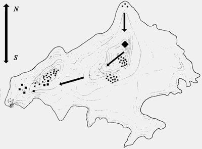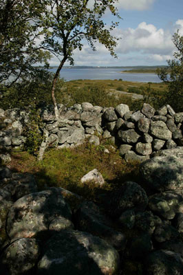 * *(карту острова)Вблизи места высадки находятся три частично сохранившиеся каменные насыпи. Они располагаются на мысу в виде треугольника со стороной около 20 метров, обращенного вершиной на северо-восток, в сторону жилых островов. Скоплений насыпей поблизости нет, значит, этот треугольник можно отнести к разряду символических выкладок. Возможное назначение – символические “ворота” на территорию святилища. Если в воротах зажигался огонь – возможны находки угля, остатков костров.