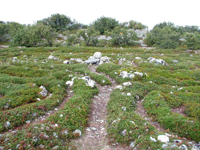 . Он проходит через пологие террасы, на которых встречаются как насыпи-могильники, так и символические выкладки. Например, единственная на Большом Заяцком острове кольцевая выкладка41.Свободное пространство между двумя вершинами острова в западном направлении простирается до начала горы Сигнальная, на вершине которой расположено большое количество насыпей-могильников и символических выкладок, а на западной и южной стороне подошвы горы – скопления лабиринтов.